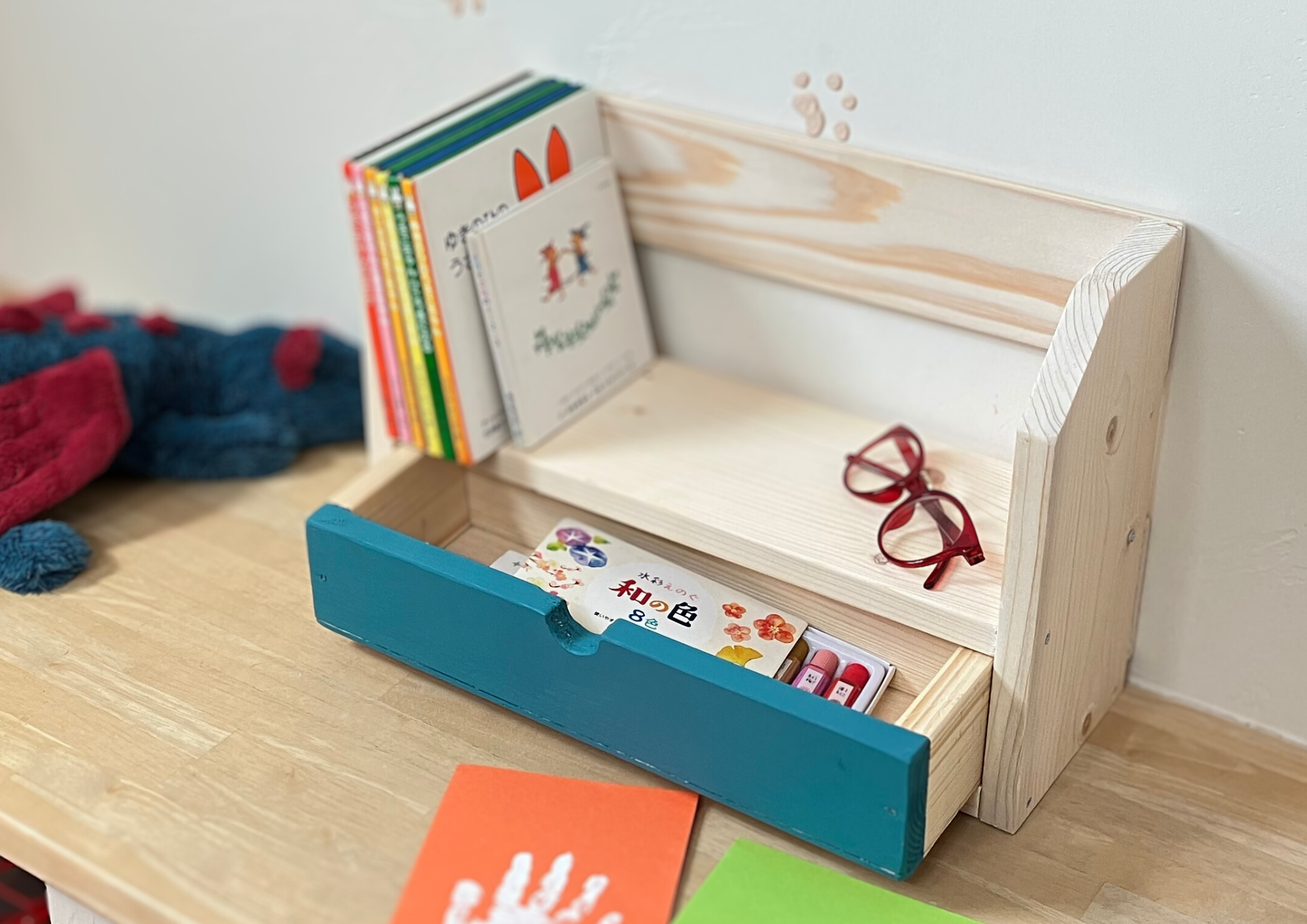 お気に入りの本を置いたり、グリーンを飾ったりと使い方が広がる引き出し付き本棚です。かわいらしいコンパクトなサイズだから、机や玄関など置き場所いろいろ。ピタッとおさまる引き出しの作り方が学べます。